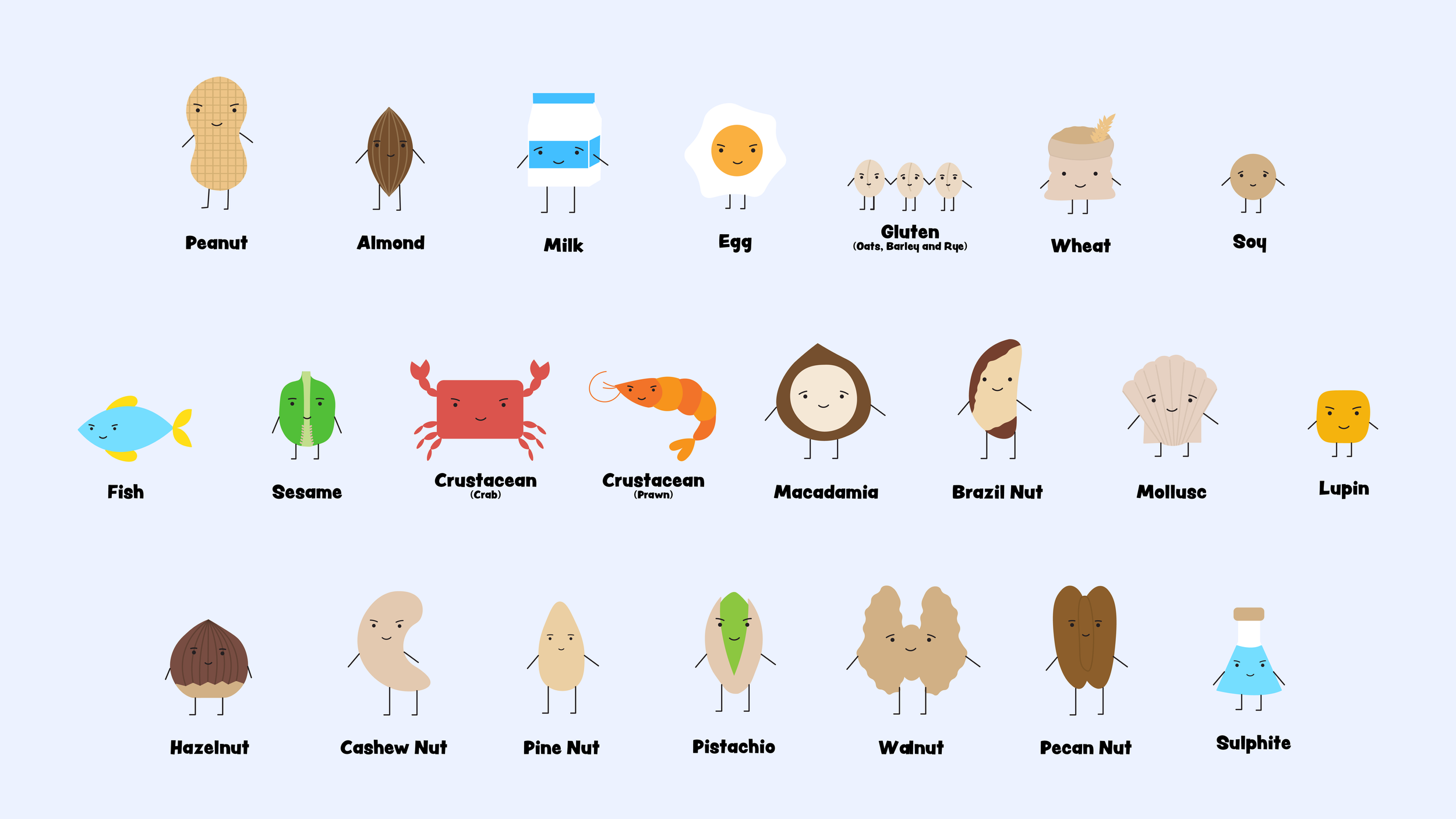 Character designs for each food allergen that must be declared in accordance to Food Standards Australia New Zealand